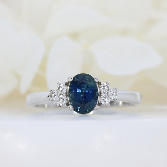 Pre Owned 18ct White Gold Oval Sapphire Ring with Diamond Cluster Shoulders