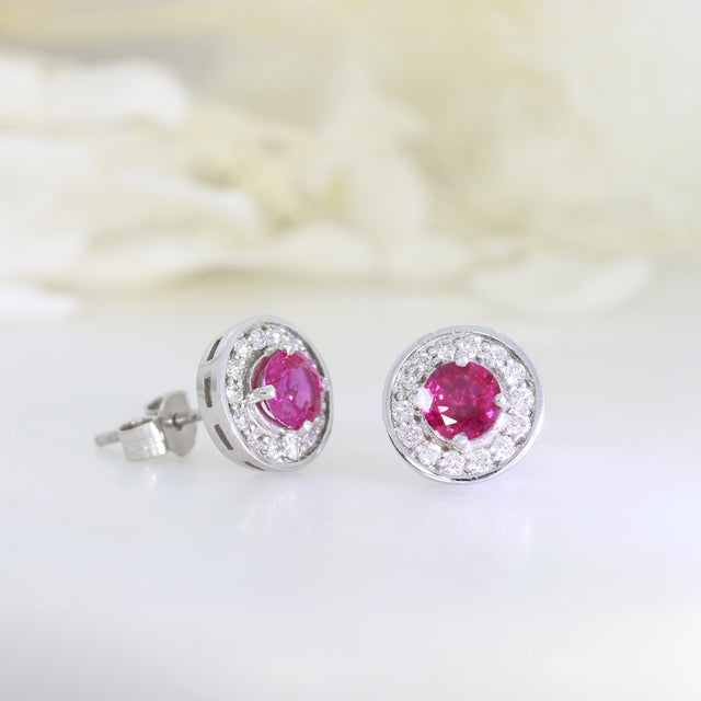 Elegant 18ct white gold stud earrings featuring a central brilliant cut ruby surrounded by a halo of sparkling pave set diamonds.