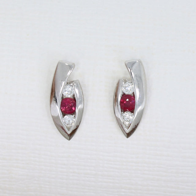 9ct White Gold Stud Earrings With Trap Set Ruby & Diamonds