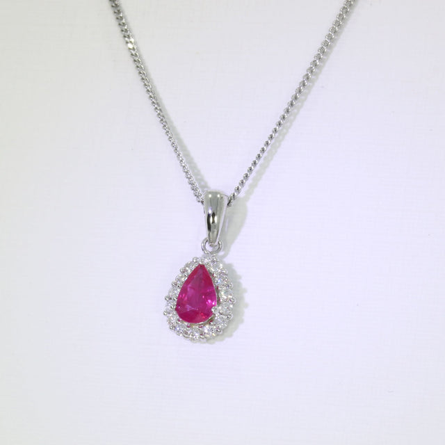 This exquisite 9ct white gold pendant combines timeless elegance and opulent beauty. Intricately designed and set with a sublime pear-shaped ruby, encircled by a halo of sparkly diamonds, on a 9ct white gold chain.
