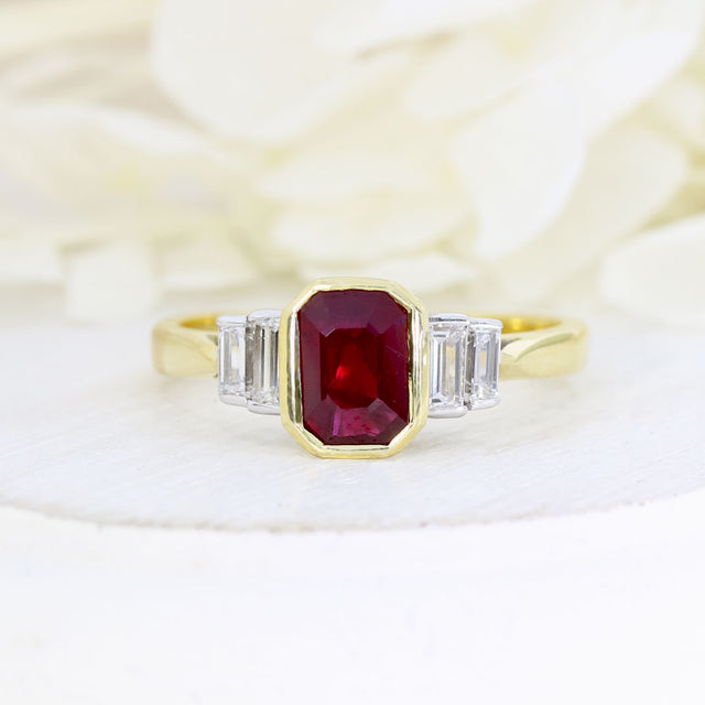 This exquisite dress ring features an 18ct yellow and white gold rub over setting, showcasing an emerald cut ruby complemented by four baguette diamonds.