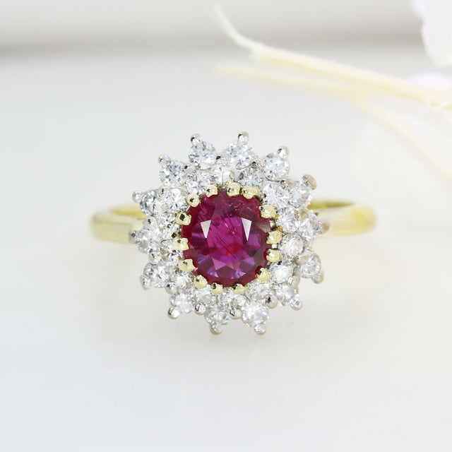 18ct Yellow & White Gold Claw Set Round Ruby and Diamond Cluster Ring