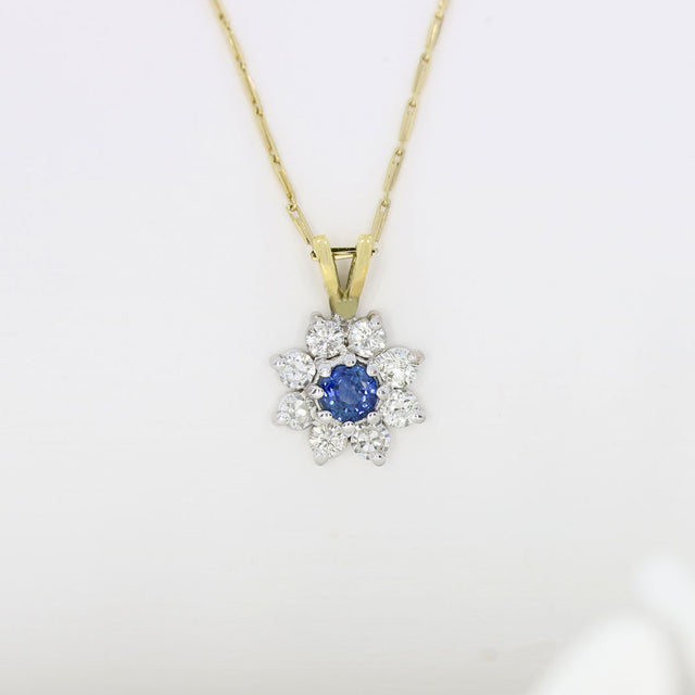 18ct Yellow & White Gold Sapphire & Diamond Flower Cluster Pendant & 18ct Chain