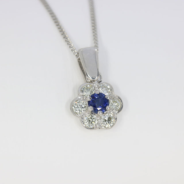 18ct Gold Sapphire & Diamond Flower Cluster Pendant on 18ct White Gold 18'' Chain