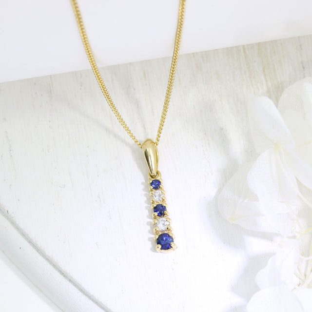 An elegant 18ct yellow gold drop pendant featuring a graduated claw set of sapphires and diamonds, presented on an 18" flat curb chain.