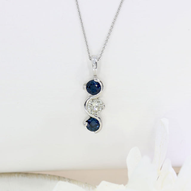 9ct White Gold Sapphire & Diamond Rub over & Claw Set 3 Stone Pendant 20" Chain