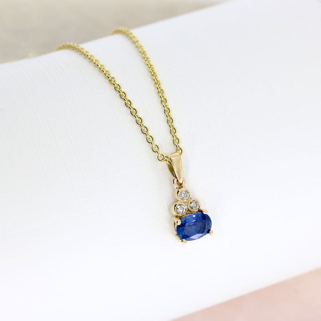 9ct yellow gold side set claw set oval sapphire pendant with three rub over set diamonds on top on a 9ct Yellow gold 18'' Anchor Chain