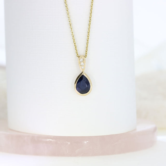9ct Yellow Gold Pear Shape Rub Over Set Sapphire Pendant With Diamond Set Bale on 9ct Yellow Gold 18" Anchor Chain