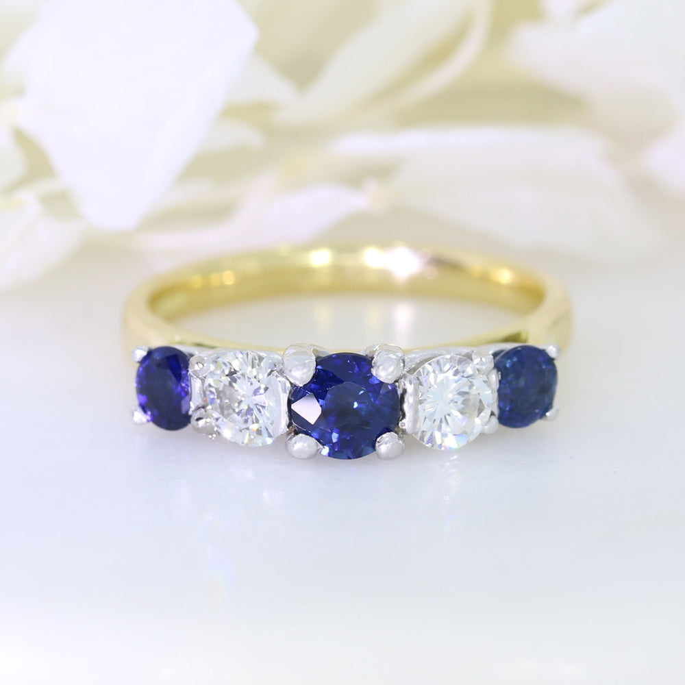 Elegant 18ct yellow gold eternity ring showcasing sapphires and diamonds in a classic claw setting.