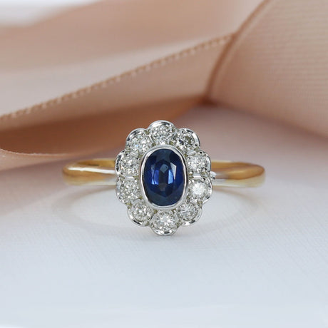 £575.00Unit price /Unavailable9ct Yellow Gold Rubover Oval Sapphire and Diamond Flower Cluster Ring