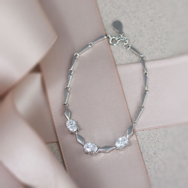 Silver Rhodium Plated Bracelet Made up of Dog Tooth Links Claw set Oval CZ's and Silver Triangles