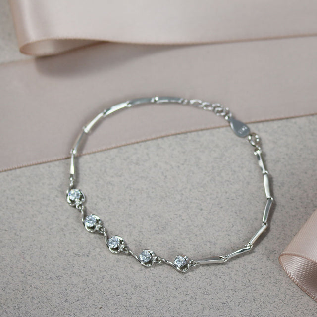 Silver Rhodium Plated Bracelet Made up of Dog Tooth Links and in the centre Five Cubic Zirconia's