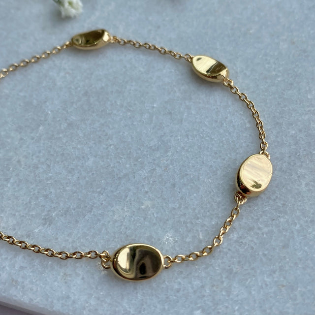 Silver 925 Yellow Gold fine trace bracelet with polished oval pebble detail 7.5'' with extender to 8'' and lobster clasp fastener