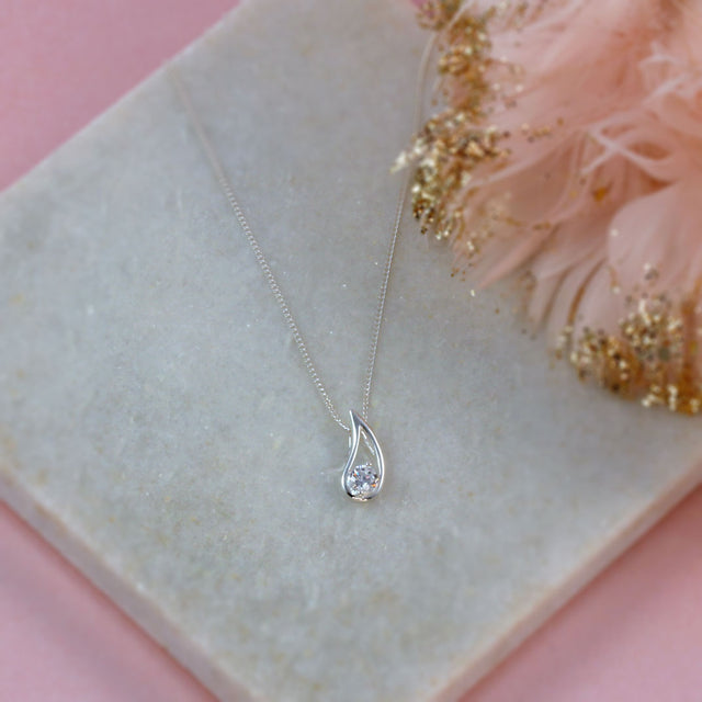 Silver open teardrop pendant with CZ at the bottom complete with 18'' fine curb chain