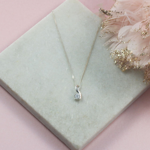 Silver swirl pendant with CZ at the bottom complete with 18'' fine curb chain