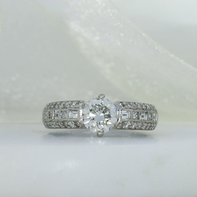 Pre Owned Platinum Fancy Dress Ring with a Round Certified Brilliant Cut Diamond in the Centre and Baguette & Round Diamond Shoulders.