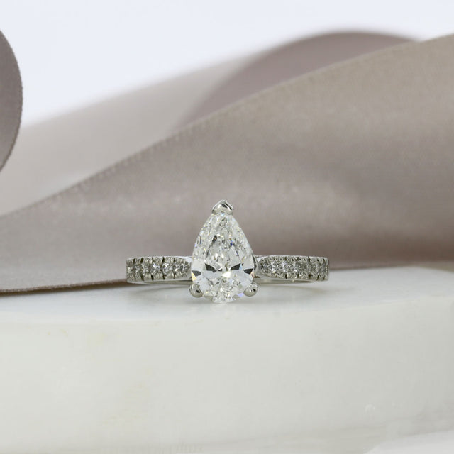 Pre Owned Platinum GIA Certified Pear Shaped Diamond Set Ring with Bead Set Diamond Shoulders