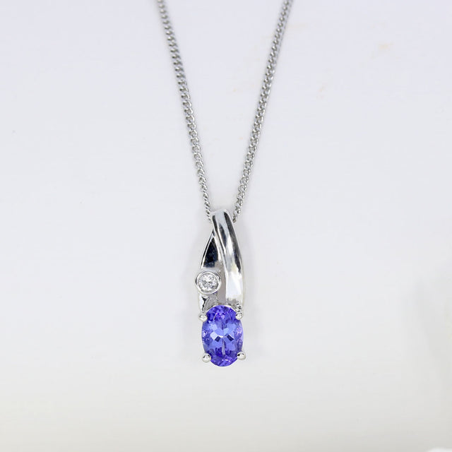18ct White gold oval claw set Tanzanite with round rubover set diamond in fancy bale pendant on a  9ct White Gold 18" Fine Curb Chain