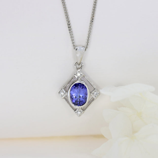 9ct White gold oval tanzanite and diamond pendant in a diamond shape setting on a 9ct White Gold 16" Fine Curb Chain