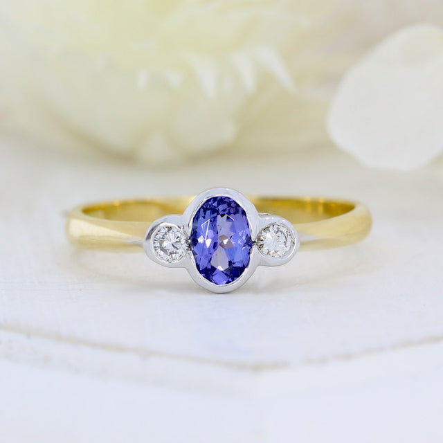 18ct yellow and white gold three stone ring tanzanite & diamond rub over set