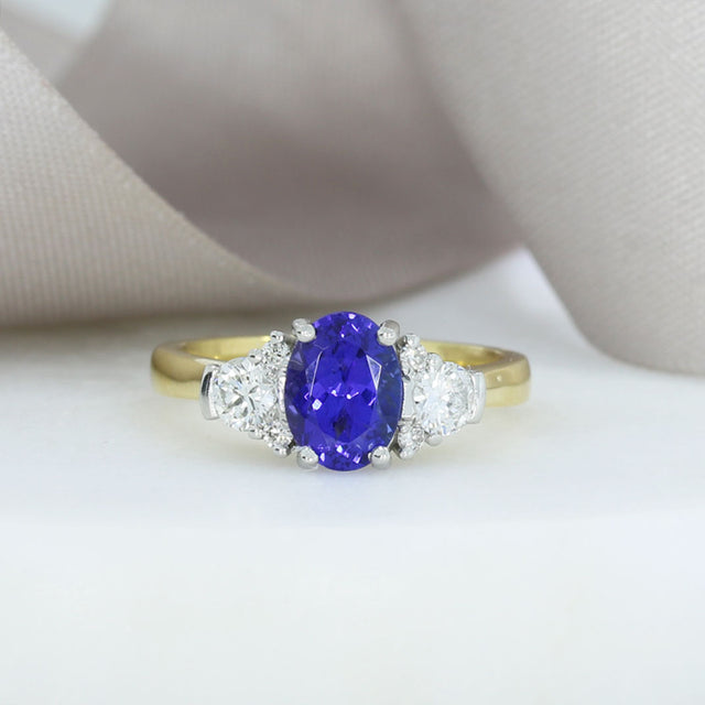 18ct Yellow Gold & Platinum Set Oval Claw Set Tanzanite 1.59ct & Round Diamond 0.40ct Cluster Ring
