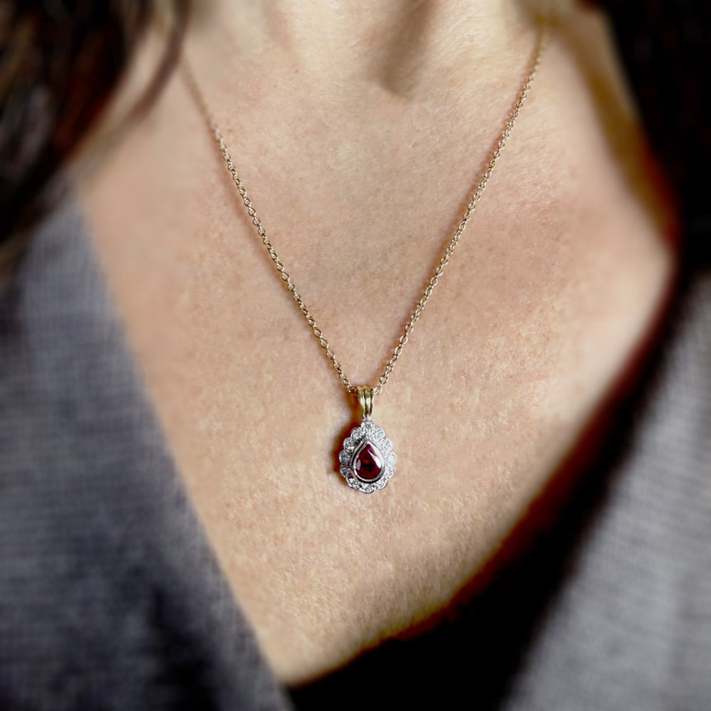 18ct Yellow and White Gold Cluster Pendant set with a Pear Shape Ruby and Surrounded by Round Diamonds on a 9ct Yellow Gold 20'' Fine Anchor Chain