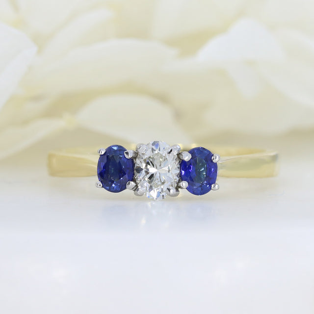 18ct Yellow Gold Oval Claw Set Diamond and Sapphire 3 Stone Ring