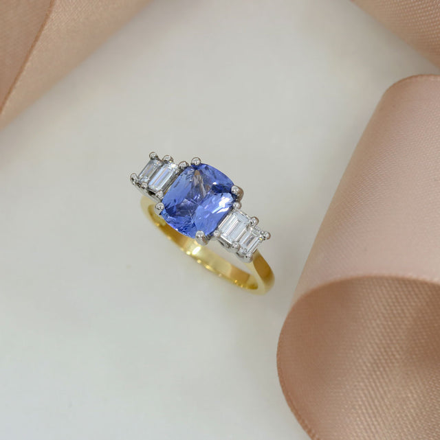 18ct Yellow Gold & Platinum Claw Set Cushion Shape Sapphire 2.60ct & Baguette Diamond 0.80ct Ring