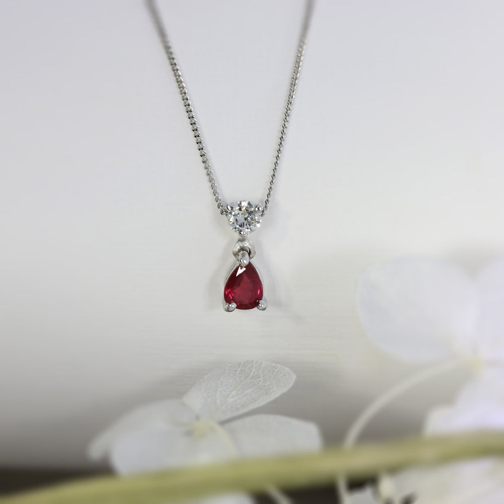 9ct White Gold Pear Shaped Ruby & Diamond Pendant on 9ct 18inch Chain