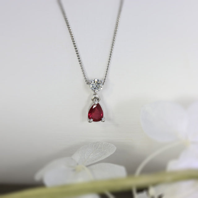 9ct White Gold Pendant with Claw Set Pear Shape Ruby & Round Diamond on a 9ct White Gold Flat Curb Chain 18" 45cm