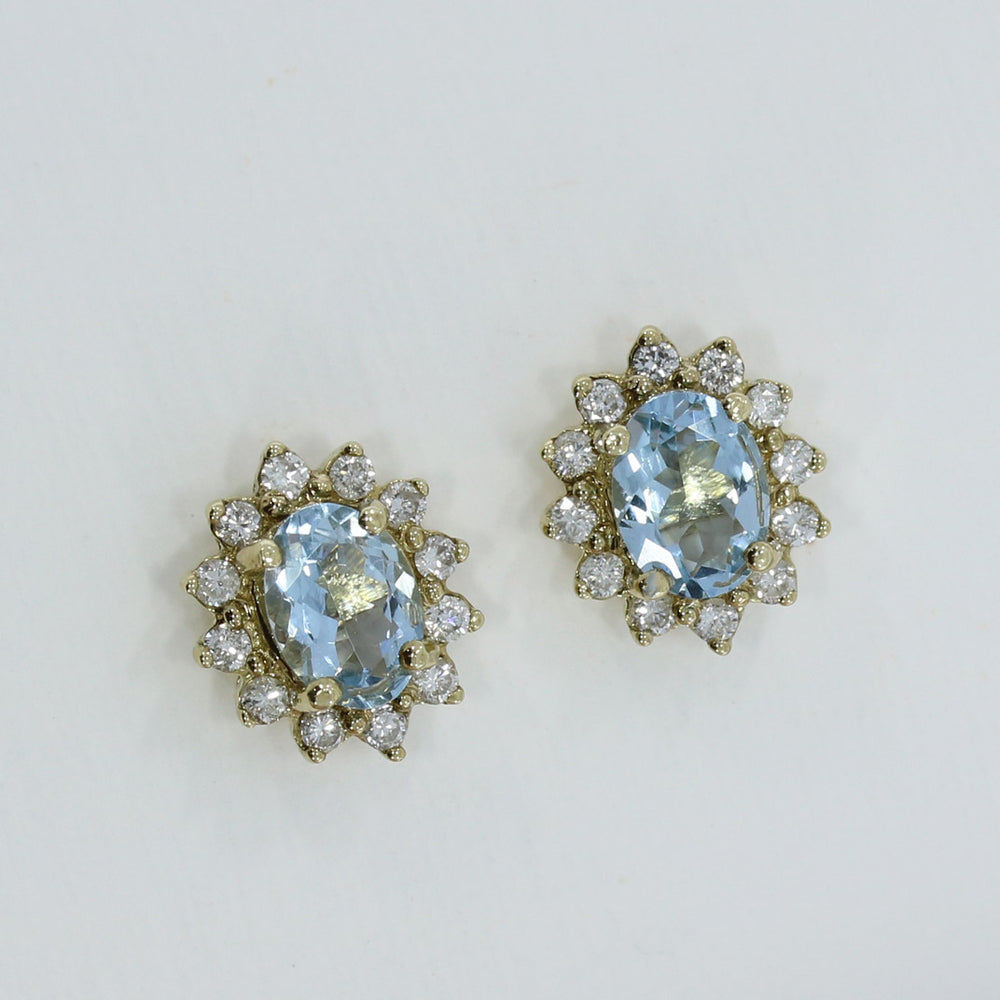 9ct Yellow Gold Oval Aquamarine and Diamond Cluster Earrings