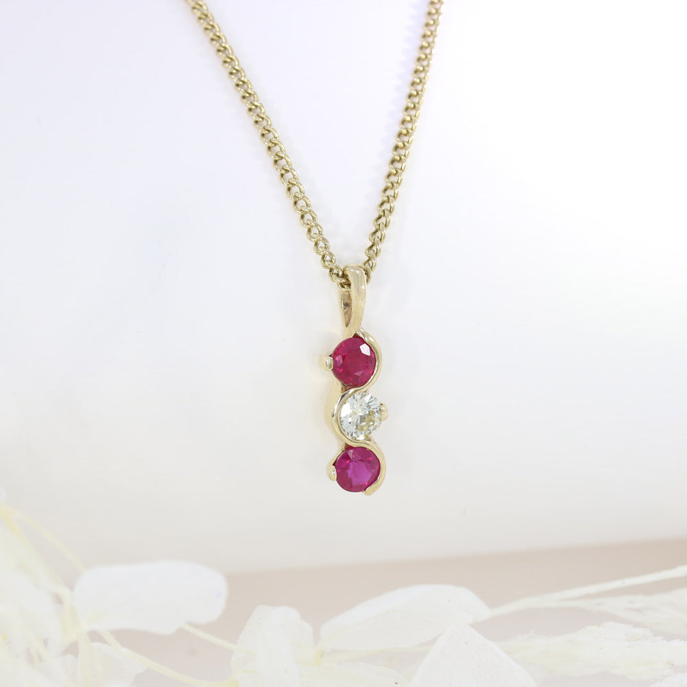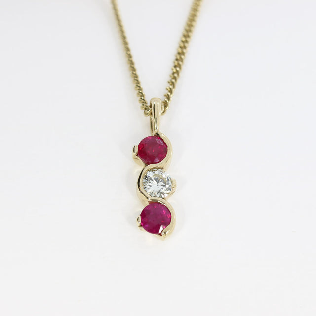 9ct Yellow Gold Ruby and Diamond Wave Style 3 Stone Pendant on a 9ct Yellow Gold 19" Chain