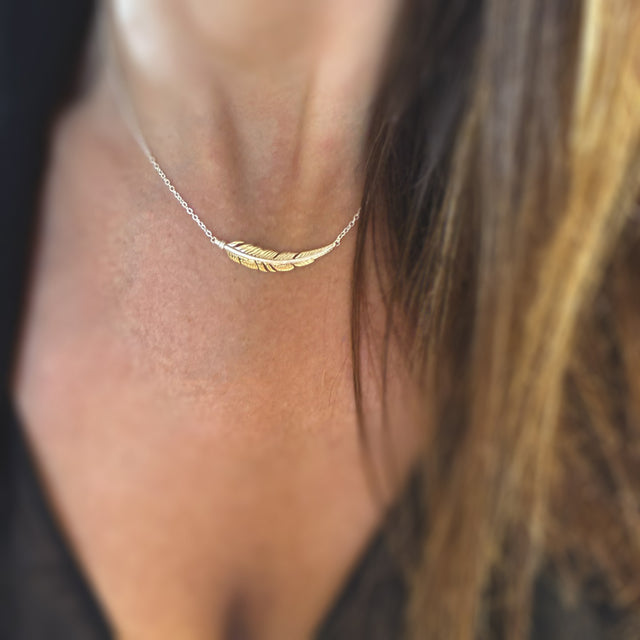 Silver Feather Necklace with Yellow Gold Accent and Extendable Chain